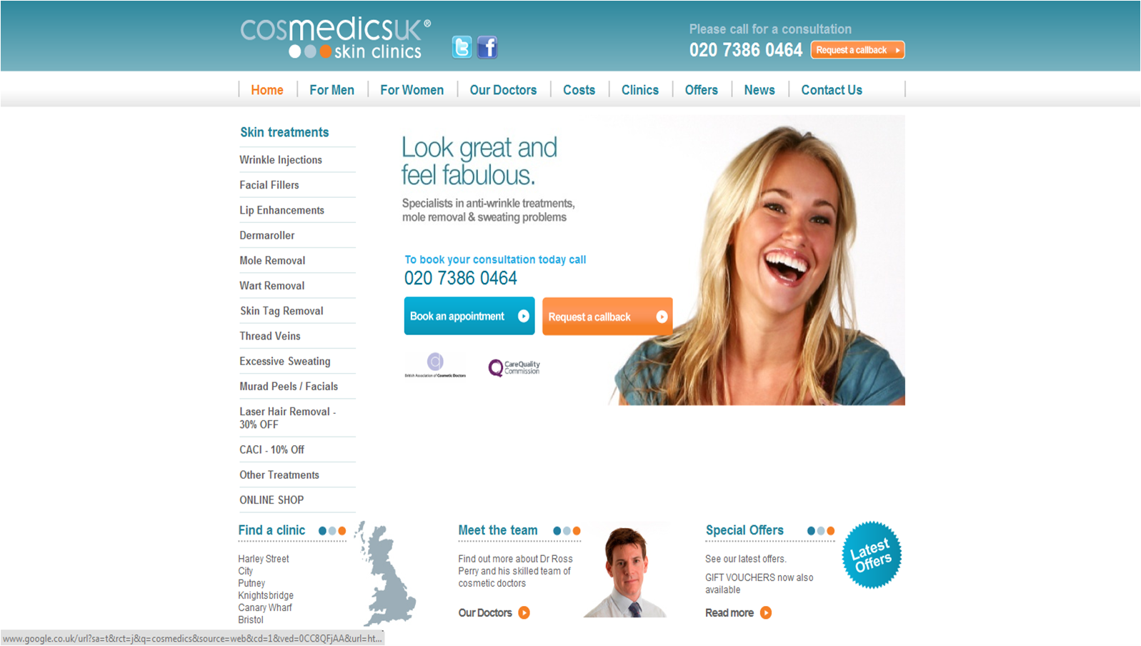 While working with Cosmedics.co.uk they were expanding to have further cosmetic skin clinics across London. I created a comprehensive online advertising account for them, especially focused on local targeting. This allowed for easy recording of advertising spend and ROI for each location, whilst targeting an audience most likely to convert to doing business with them. The results were a success, as noted below in a quote from the Director of Cosmedics.