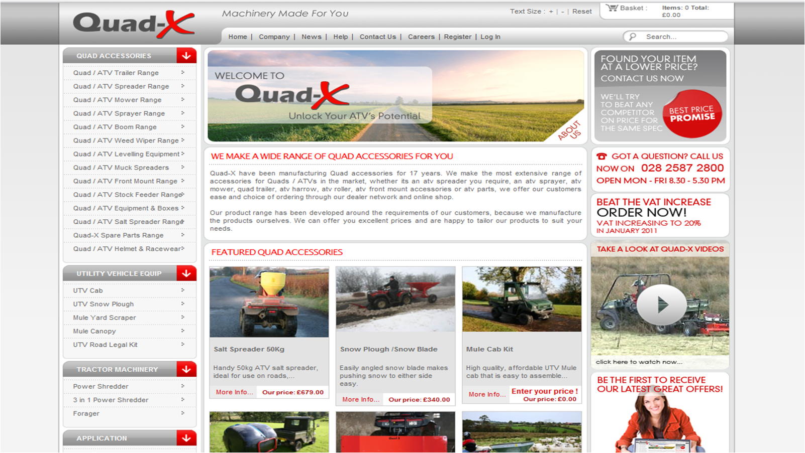 www.Quad-X.com have been manufacturing Quad accessories for 17 years. They make the most extensive range of accessories for Quads / ATVs in the market, whether its an atv spreader you require, an atv sprayer, atv mower, quad trailer, atv harrow, atv roller, atv front mount accessories or atv parts. They offer their customers ease and choice of ordering through their dealer network and online shop.